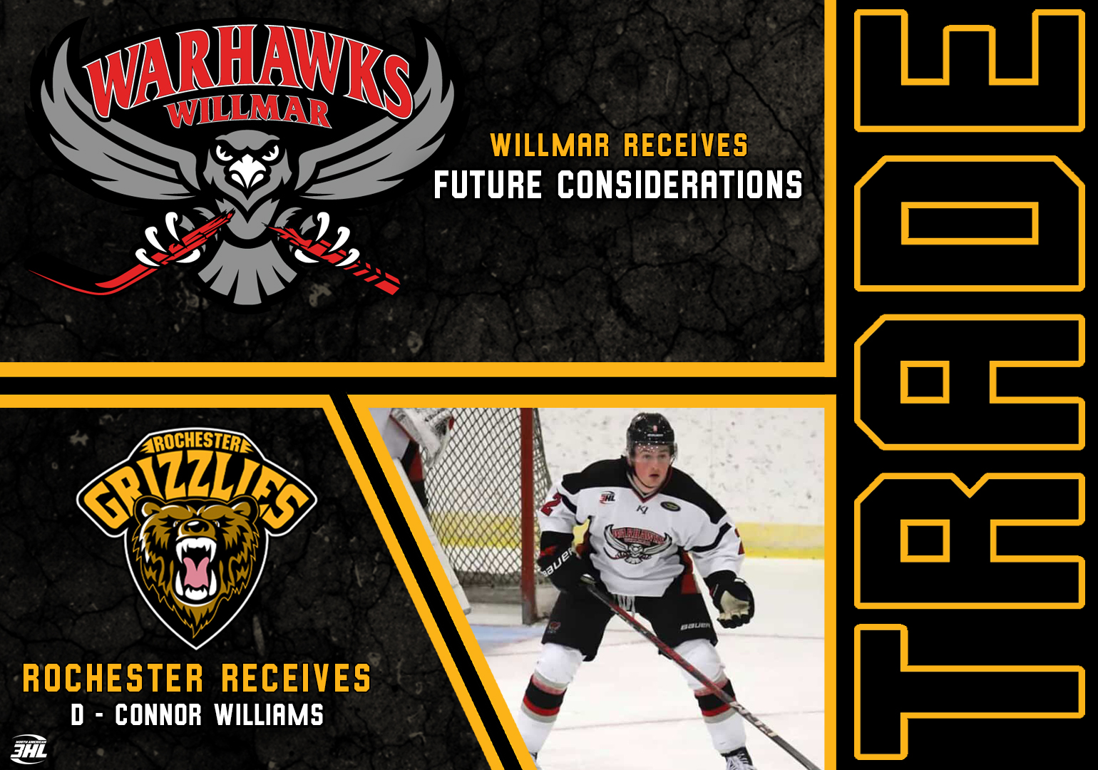 ROCHESTER, Minn. – The Rochester Grizzlies have acquired defenseman Connor Williams from the Willmar Warhawks for future considerations, the team announced this week.