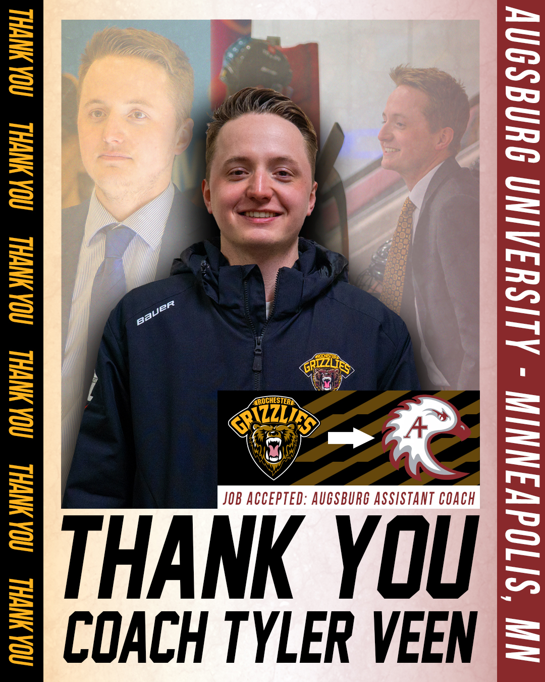 Rochester, MN — The Grizzlies Head Coach and General Manager Tyler Veen has accepted a job as an Assistant Coach with Augsburg University’s Men’s NCAA D3 Hockey Team.