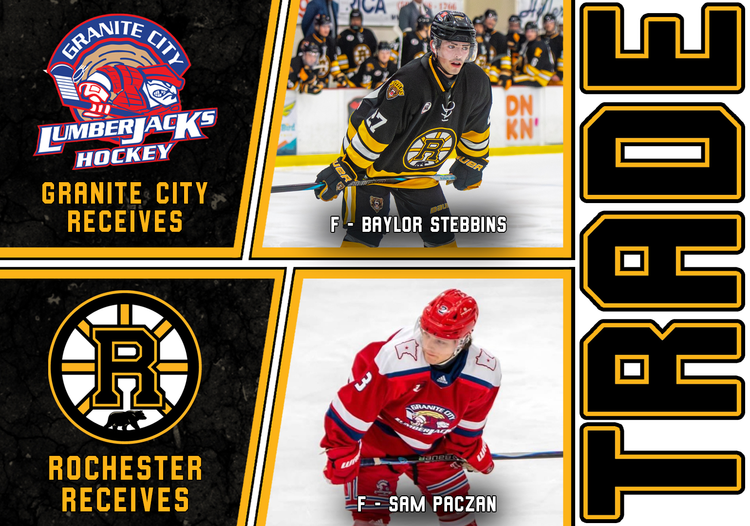 ROCHESTER, Minn. – The Rochester Grizzlies announced today they have traded forward Baylor Stebbins in exchange for Sam Paczan from the Granite City Lumberjacks.