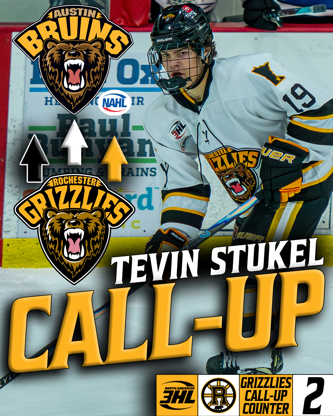 ROCHESTER, Minn. – Last weekend, Rochester Grizzlies forward Tevin Stukel got the call-up to the Austin Bruins of the NAHL, playing in one of two games against the St. Cloud Norsemen.